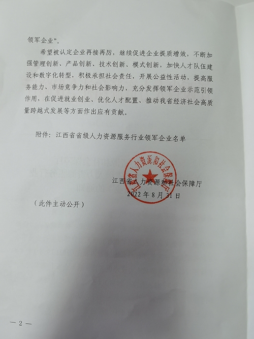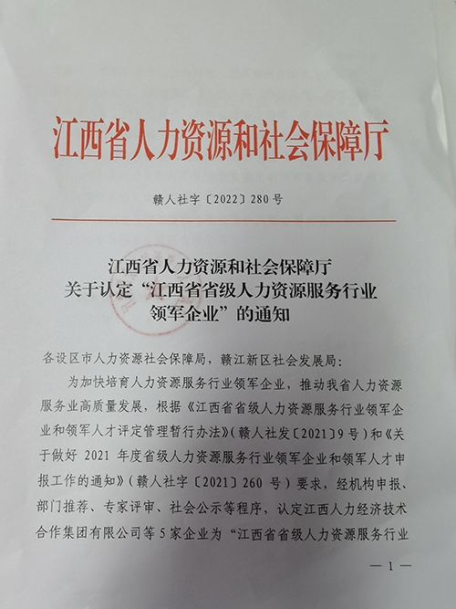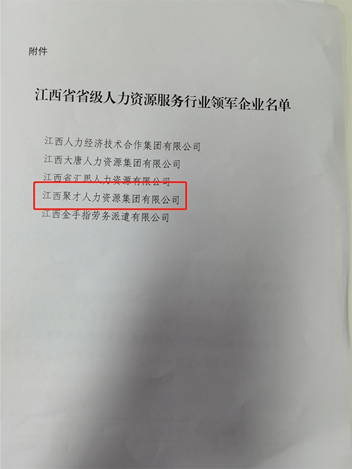 根据《江西省人民政府关于加快人力资源服务业发展的意见》(赣府发〔201827号)和《江西省省级人力资源服务行业领军企业和领军人才评定管理暂行办法》(赣人社发〔20219号),2021年度省级人力资源服务行业领军企业申报工作自20219月开始。经自主申报,历经县(市、区)人社部门初审、设区市人社部门复核推荐、专家组综合评审等程序,江西聚才人力资源集团有限公司(简称:聚才人力集团)荣获“江西省人力资源服务行业领军企业“荣誉称号。
