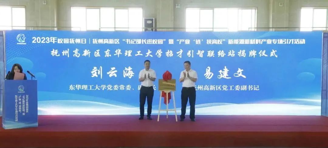 校地双方领导共同进行2023年“校园抚州日”——抚州高新区“书记部长进校园”暨“产业‘链’接高校”新能源新材料产业专场招才引智联络站揭牌仪式,正式揭开专场引才活动序幕。